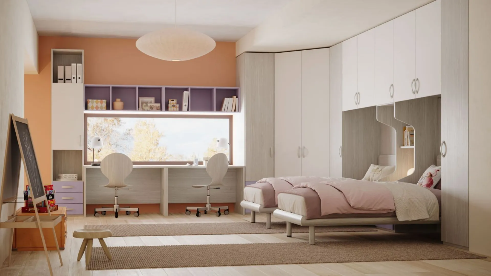 In questo schema, i due elementi diventano complementari: la scrivania si estrae all’occorrenza, il letto scorre in avanti o si richiude per liberare il passaggio. Così, durante il giorno si ottiene un’area ampia per studiare, mentre la sera tutto si riconfigura rapidamente per il riposo.