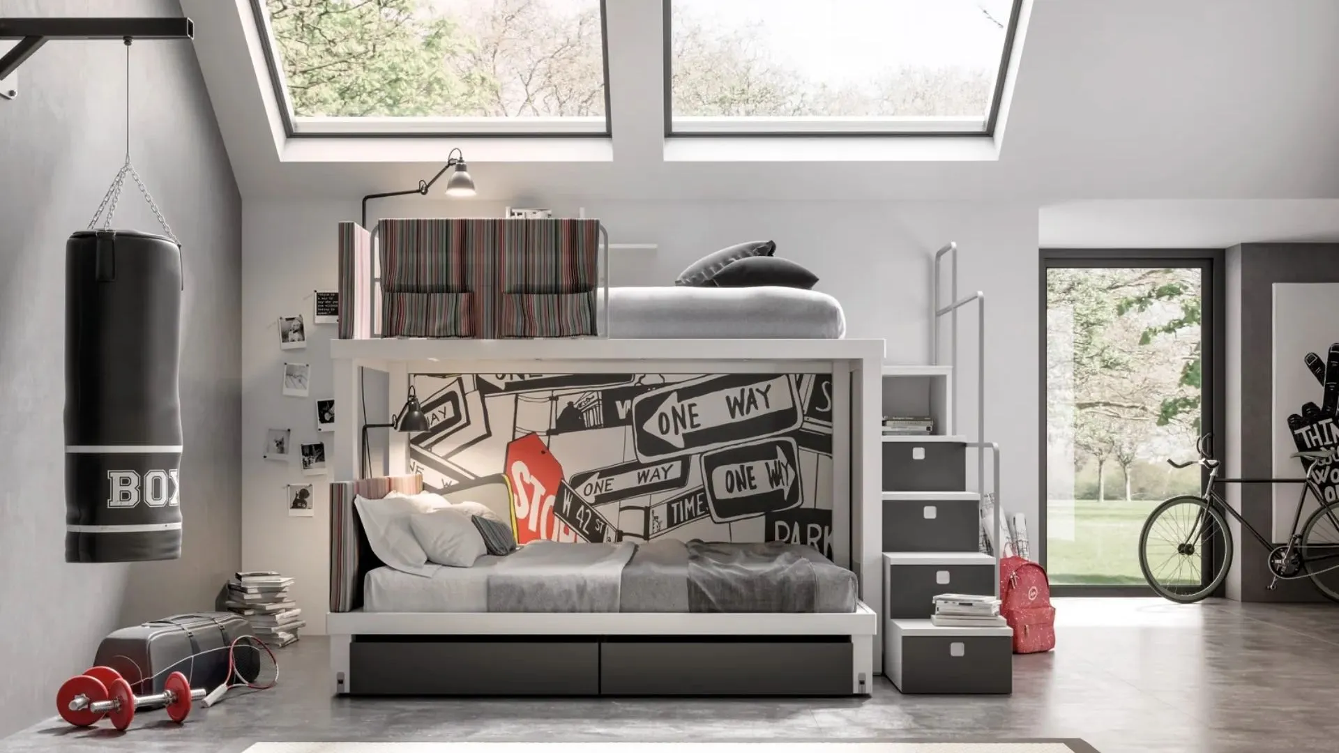 Cameretta a castello per bambini di Clever con letto Sky 116. Al letto in alto si accede tramite una scaletta e pedana posteriore. La posizione delle reti può essere parallela alla parete o una delle due sfalsata.