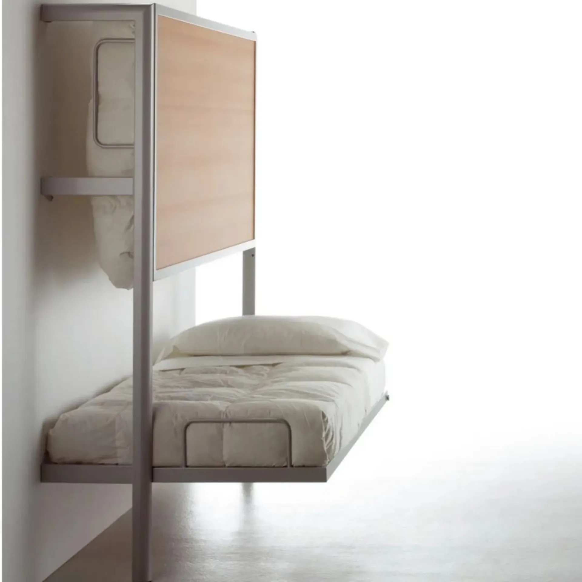 Nella progettazione delle camerette moderne lo spazio libero a terra è sempre più prezioso. I letti a castello a scomparsa propongono un layout nuovo, liberando i centimetri che verrebbero occupati ad esempio da letti singoli imbottiti.
